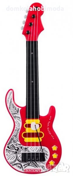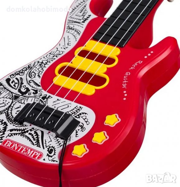 Електрическа рок китара играчка, с каишка за рамо, кирка, 6 предварително записани мелодии, светлинни ефекти, 4 рок песни, музикална пауза и автоматично изключване. Работи с 3 батерии АА (не са включени).