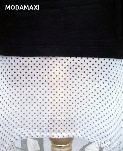 Черна, трикотажна блуза с подгъв от бял шифон с черни точици.