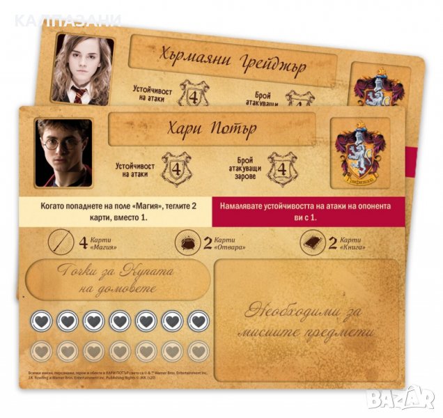 210 карти (Действие, Битка, Дуел, Събитие, Книга, Отвара, Куидич, Магия)