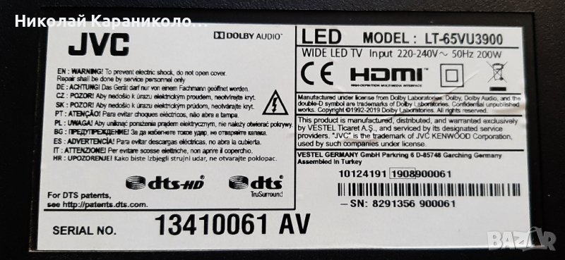 Продавам тв. JVC LT-65VU3900 за части по причина-счупена матрица/VES650QNTS-2W-U12/.Редовни съответно: