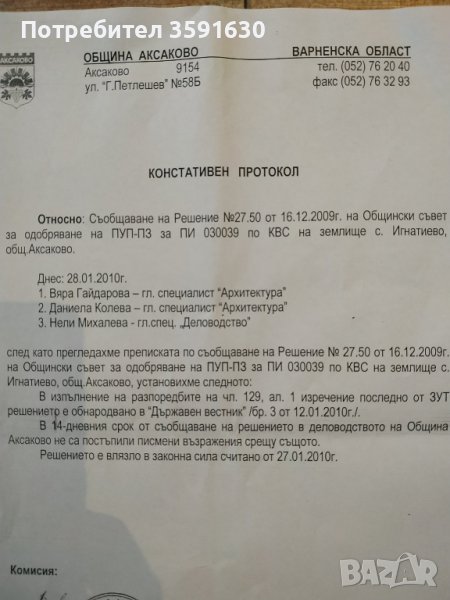 Собственик продава УПИ с ПУП-ПЗ и площ от 4400 кв. м (правоъгълна форма с размери около 95м х 46м), находящ се в местност 'Мъзгите', в землището на гр. Игнатиево (община Аксаково, област Варна). Имотът е на 40м (втори парцел - без никакви сервитути) от Републикански път I-2 (старият път за София). Съгласно УП районът е отреден за производство, търговия и логистика с параметри на застрояване съгласно ПУП-ПЗ от 2010г зона :Соп КИНТ 2; Плътност 50%, КК 10м. Възможно РЗП около 6000 м2 . Съседния парцел също е с влязъл в сила ПУП. В близост са базата на Комфорт ООД и Логистична База на търговска компания. При реален интерес може да се обадите на посочения телефон или да изпратите запитване на e-mail: