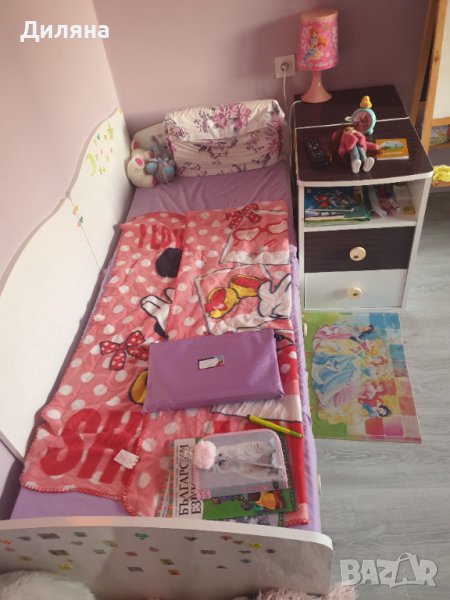 Комплекта включва гардероб,легло с матрак и нощно шкафче в цвят бяло с тъмно лилаво гланц.