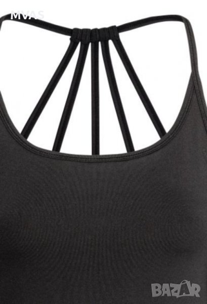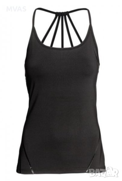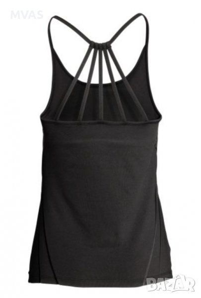 Нов потник на H&M черен за йога от бързосъхнеща функционална материя с вграден мек спортен сутиен с ластик в долния край(т.е още един слой плат при гърдите с ластик, че да не прозира).