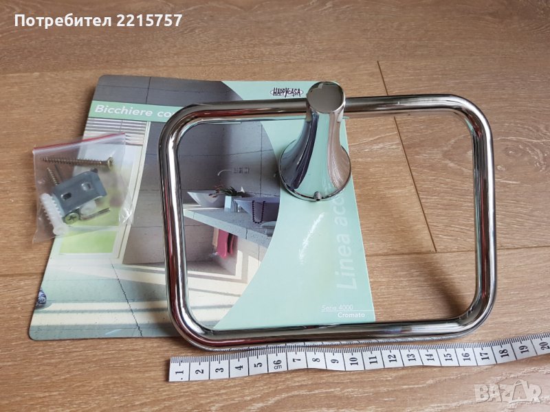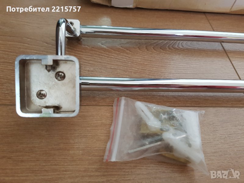 1)Хромирана, двойна подставка за кърпи в баня. Дълга 61см. Ново. Цена 20лв...................................................................................................................2) Държач, квадратен за кърпа. Закупен в Италия. Дължина 17,5см. Ново. Цена10лв