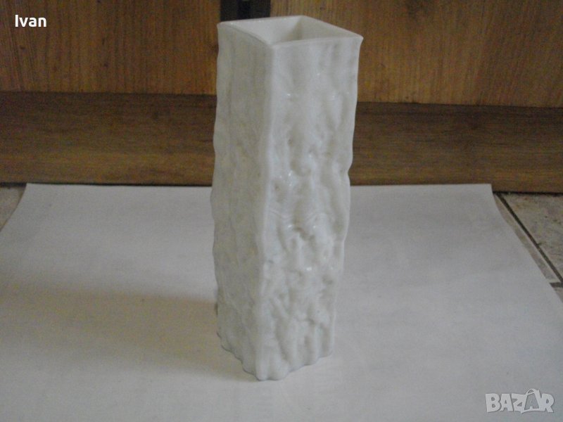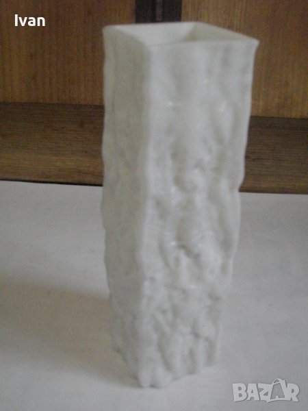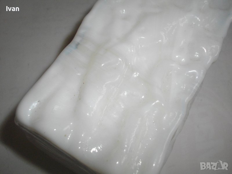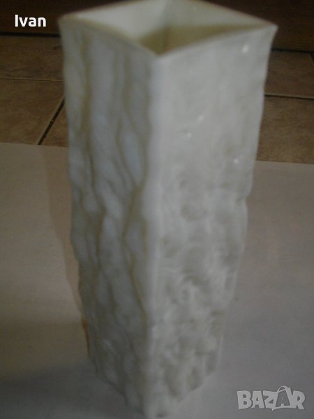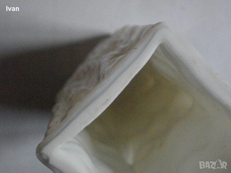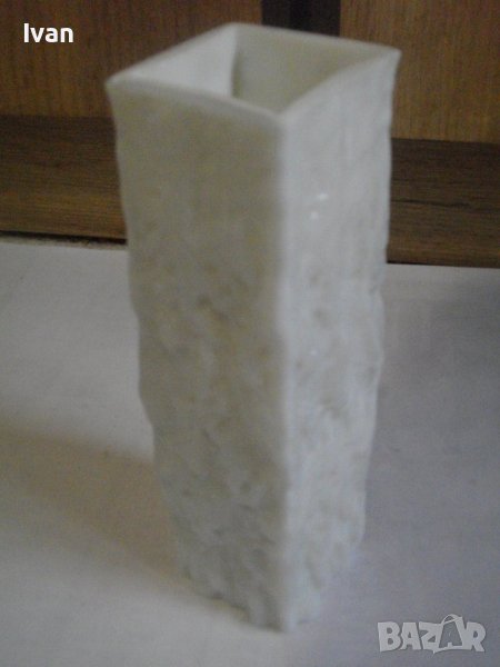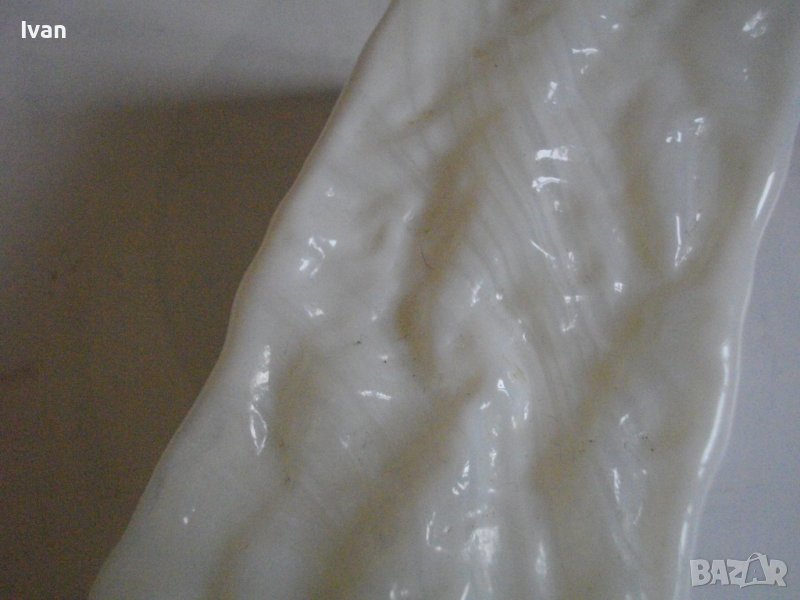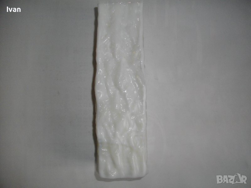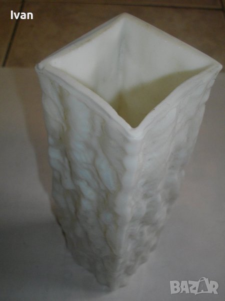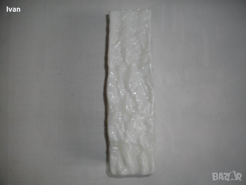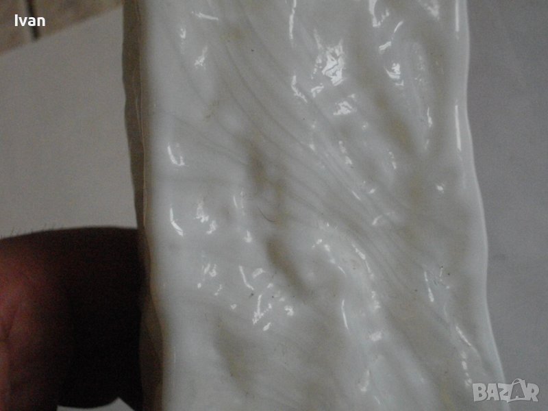 Вазата е релефна, с преливащ млечно бял цвят.
