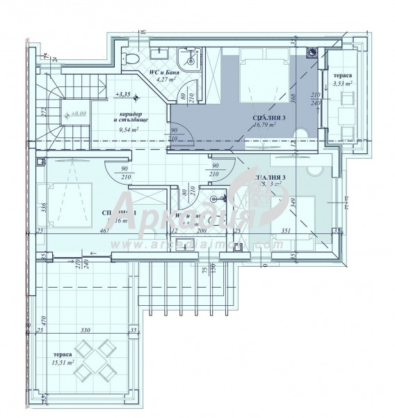 Етаж 2 - Три спални. Родителска със собствен санитарен възел и тераса, баня с тоалетна, просторна тераса, коридор.