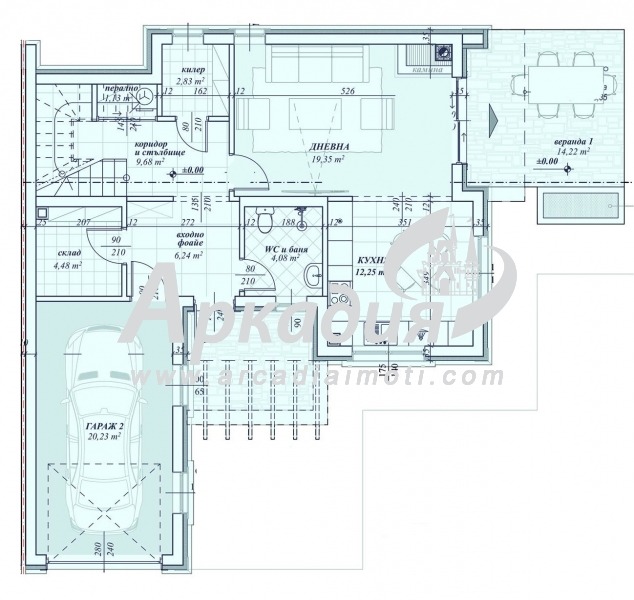 Етаж 1 - Просторна дневна с трапезария и кухня, баня с тоалетна, излаз на самостоятелен двор и веранда, входно антре, килер, перално помещение сервизно помещение, гараж, парко място.