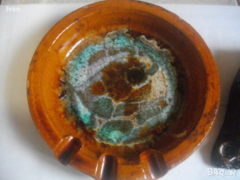 Голям кафяв глинн/керамика - диамеътр ф 180 мм. Глна изпечена с глазура и ръчно направен рисунки/декорации. Без абелжки, без чипове. Единствено едно малко палченце глазура от 3 мм е отчекнато и липсва. Тегло на пепелника - над 1,0 кг.