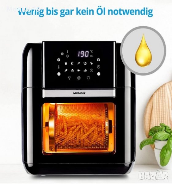 Мултифункционален фритюрник с горещ въздух с мощност 1500 W и 360° система за нагряване за пържене, печене, грил и печене без масло. Включва решетка, кошница и грил. Перфектно разпределение на топлината: Фурната с горещ въздух приготвя храната ви равномерно, нежно и бързо благодарение на 360° нагряваща система с 1500 вата мощност. Шиш на грил: От пиле на скара до печено на скара - с включеното шишче за скара, 10-литровият капацитет на фурната с горещ въздух превръща всяка кухня в реалност. Подходяща за съдомиялна машина: Самата фурна с горещ въздух се почиства много лесно и всички аксесоари са подходящи за съдомиялна машина.