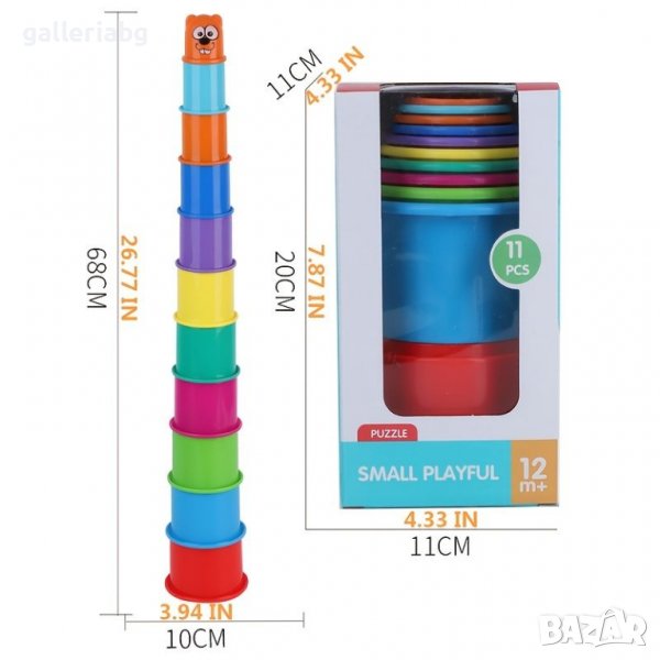 Детски цветни чашки за редене – 11 части, 68 см кула, образователна игра 12+ месеца