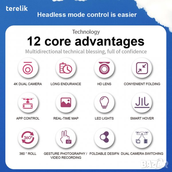 Функция: Нагоре / надолу, Напред / назад, Завиване наляво / надясно, Полет натстрани, Скорост на полета на 3 нива, LED светлини, Режим без глава, Автоматично връщане с един бутон, Режим задържане на височина, WiFi FPV, Полет по маршрут, Камера / Видео