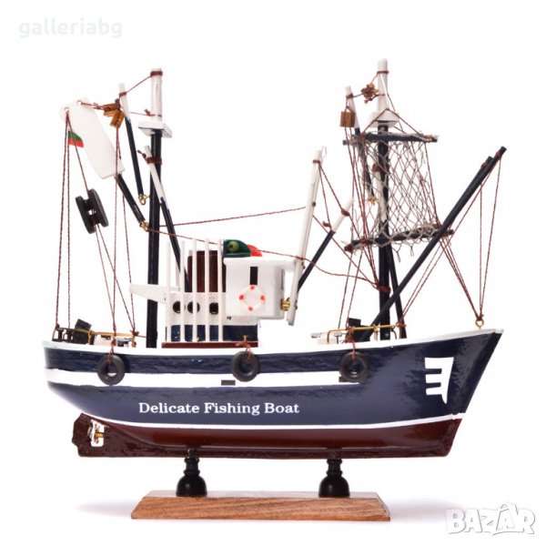 рибарска лодка с българското знаме и надпис Delicate Fishing Boat, изработена от дърво.