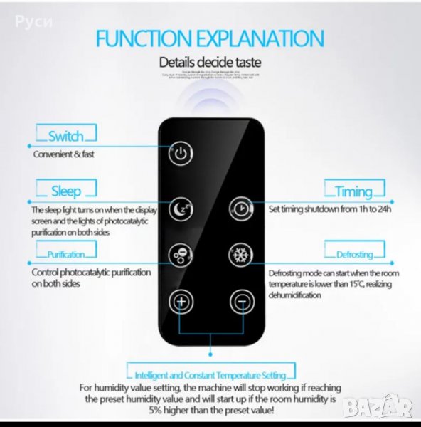Дистанционното е с таймер, задаване на желаната влажност, вкл/изкл на йонизатор, нощен режим... Има възможност за ползване на шлаух за директно извеждане на водата( включен в комплекта)