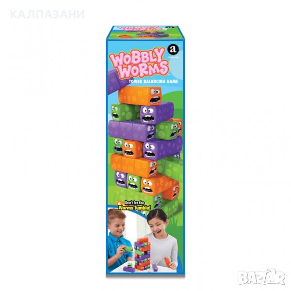 Класическата игра с кула за баланс е тук със забавен цветен дизайн с весели лица на червейчета.