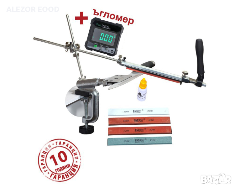 Професионално точило със захващане тип стяга (менгеме) за плот. Чрез системата за завъртане на щипката фиксираща острието не се налага да освобождавате ножа, за да обърнете другата страна за заточване. Необходимо е само да издърпате щипката и да я завъртите в желаната посока. По този начин можете да изберете вертикална или хоризонтална позиция за заточване на острието или да го завъртите на 360 градуса. Ъгълът на абразива спрямо острието на ножа може да варира от 5 до 90 градуса. Конструкцията е изцяло стоманена, устойчива на всекидневни натоварвания. Чрез тази система за заточване под фиксиран ъгъл може да се заточват остриета на ножове, ножици, дърводелски длета, ножове на дърводелско ренде, бръсначи и други режещи пособия.