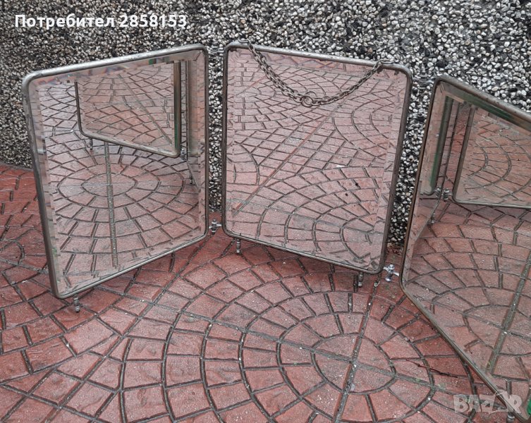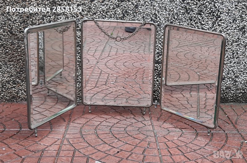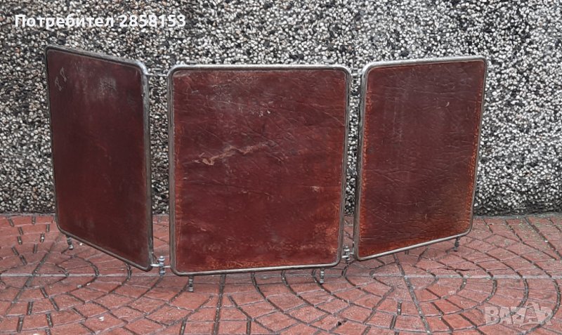 Военно офицерско сгъваемо огледало триптих/за бръснене/,със скосени ръбове и верига за окачване. Период 19 в. Идеални за интериор,декорация. През годините е ползвано в бръснарски,фризьорски салон,за грим.