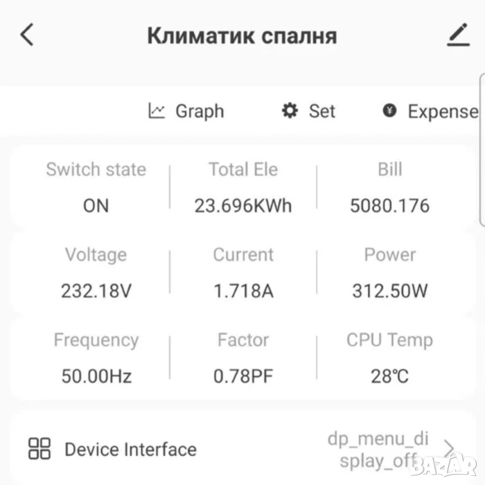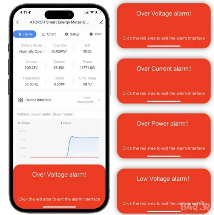 • Информация за напрежение, ток, консумация на енергия в реално време, обща мощност и др.