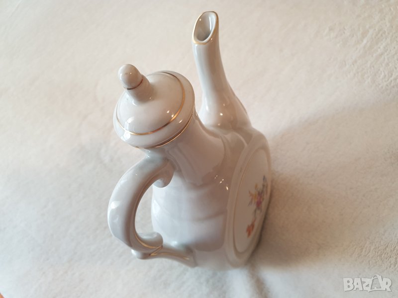 Продавам класическо ретро порцеланово бърдуче (бърде, бърдук - стомна за ракия или друго) с капаче и декорация с цветя и изрисувано със златни линии и кантове от 60-те на Завод за порцелан Китка Нови пазар.