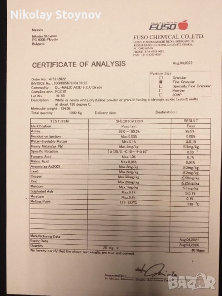 Имам удоволствието да Ви предлажа ябълчена киселина произведена от Fuso Chemical, с присъщата за японците прецизнозност и качество.