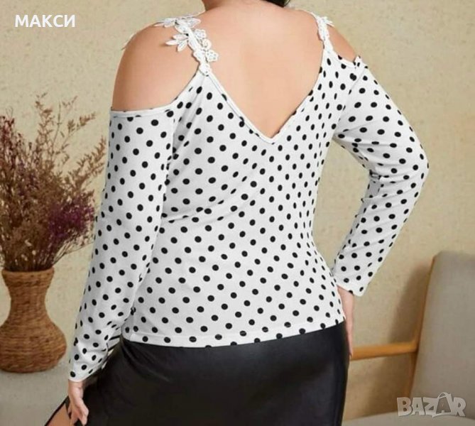 Модерна елегантна еластична блуза на точки с голи рамена и красива бяла дантела, снимка 1 - Блузи с дълъг ръкав и пуловери - 39884501 Модерна елегантна еластична блуза на точки с голи рамена и красива бяла дантела, снимка 2 - Блузи с дълъг ръкав и пуловери - 39884501 1/2