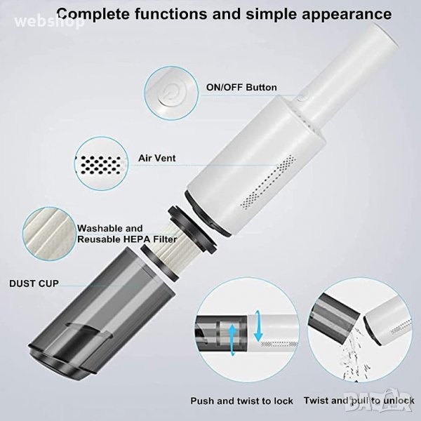 1 * Прахосмукачка за кола , 1 * Кабел за зареждане, 1 * Дълго гърло, 1 * Ръководство и Опаковка