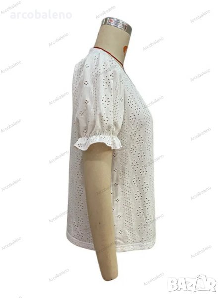 Едноцветно дамско горнище с V-образно деколте и къс ръкав с модерен стил и мека и удобна материя. Независимо дали е ежедневно, излизане, ваканция, работа и т.н., може да се носи на машина или на ръка. Материята е устойчива на намачкване и на начупване. Размерът се измерва на ръка, като е нормално да има грешка от 1-3см.