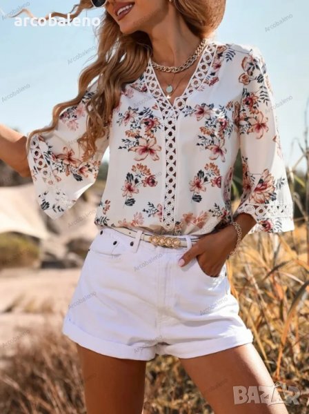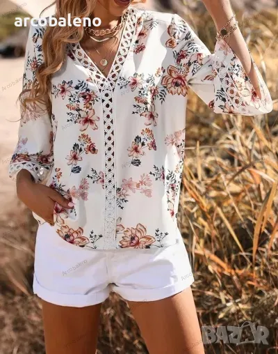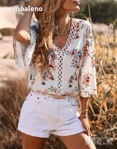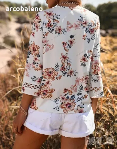 Дамска риза с разкроени ръкави и щампа с V-образно деколте, 5цвята