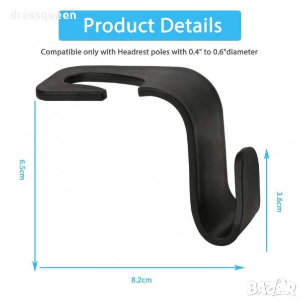 Цветът на закачалката е черен, така че пасва идеално на дизайна, изглежда дискретно. Удобната кука за облегалката за глава е изработена от висококачествен и екологичен полиуретан, така че е много издръжлива, устойчива на износване, не се драска и не се напуква. Оптималните размери на закачалката са подходящи за почти всички модели автомобили. Карайте с комфорт, защото вече нищо няма да ви спре!