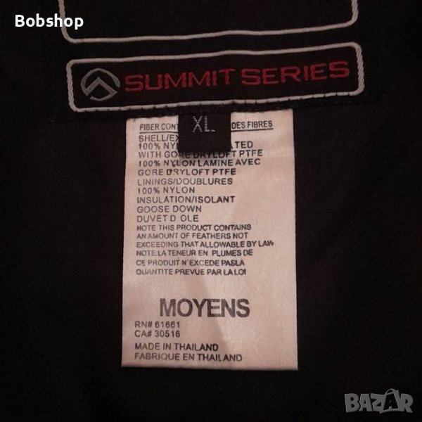 Отлично състояние, оригинален винтидж продукт, размер по етикет XL но отговаря на размер M-L, материя външна част 100% ламиниран найлон с Gore driloft ptfe, подплата 100% найлон, пълнеж гъши пух, два основни джоба на лицевата част с ципове, два вътрешни джоба с ципове, машиннобродирано лого на лицевата част и гърбът, скрита качулка в яката с регулация, регулация на кръста, ластик на ръкавите и регулация с велкролепенка, ципове ykk, произведено в Тайланд.