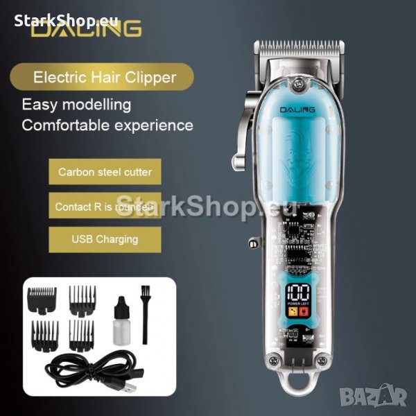 Професионална бръснарска машинка за подстригване DALING притежава стоманено острие, за да осигури бързо и ефективно бръснене или подстригване. В средата на предната част на държача на машинката има LCD дисплей, който показва капацитета на батерията. Машинката включва шест приставки с различни размери и предпазител на острието, с които можете лесно да контролирате дължината на косата, която искате да подстрижете и да създавате различни прически. Машинката се захранва посредством USB кабел включен в комплекта. Дизайнът на тримера е изчистен и елегантен и подканва за прецизна работа за оформяне на брада, мустаци и ефектна мъжка прическа.