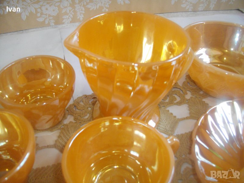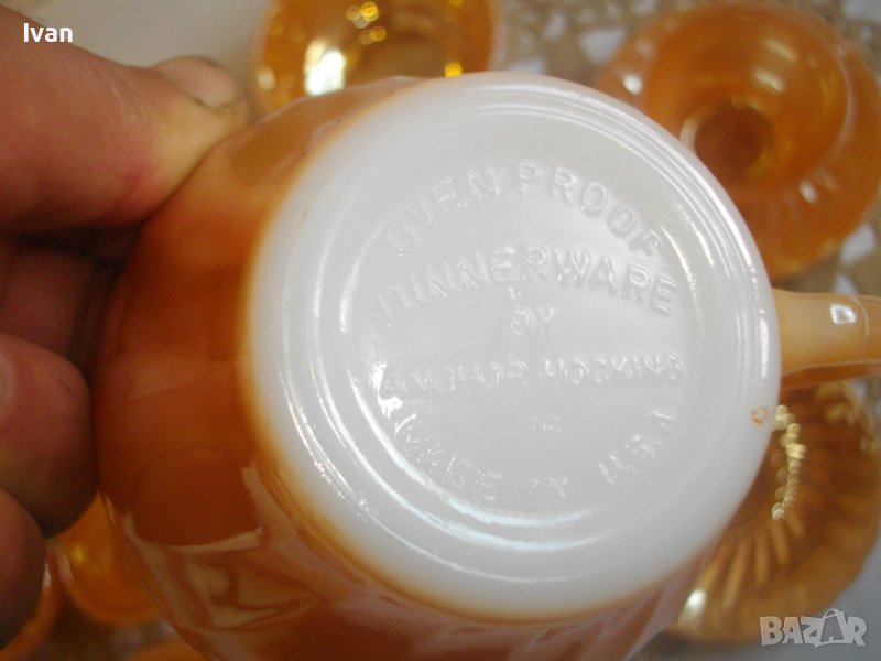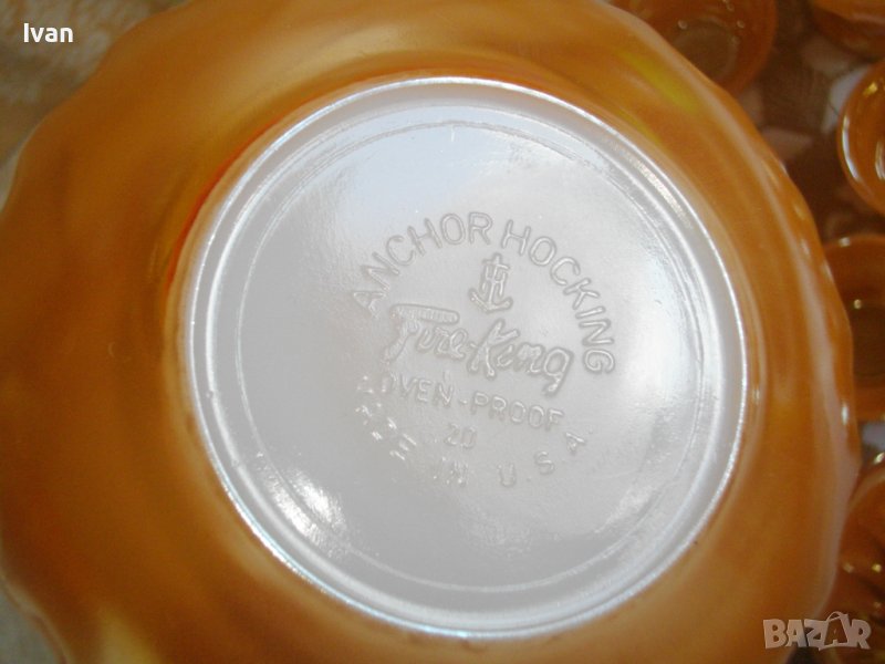 Този стъклен сервиз за кафе Fire King е произведен от Anchor Hocking от началото на 40-те до 70-те години на миналия век в Съединените щати. Комплектът се състои от чаши, чинийки, каничка за мляко и купчка. Това е ранна версия с релефна маркировка върху основата (по-късните части бяха маркирани с подвижен стикер).