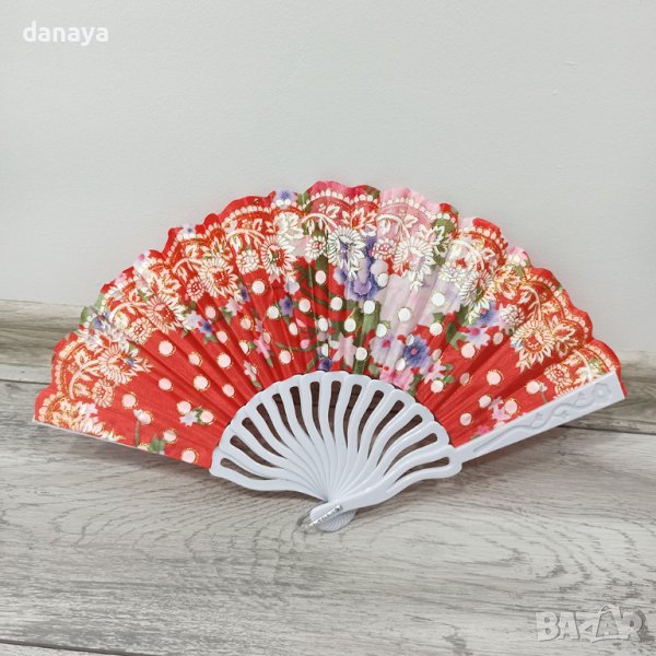 Красиво дамско ветрило с принт на цветя, бели точки и брокат. Изработено от пластмасова основа и текстил. Лесно отваряне и сгъване. С кука в края си за закачане на стена или за дамска чанта. Предлага се в различни цветове.