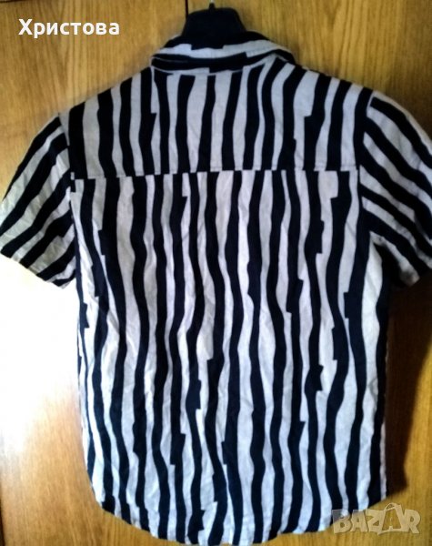 Мъжка риза от плътен памук в тъмно бежово и черно, с неправилно вертикално райе и къс ръкав. По етикет е XL, но отговаря на L.