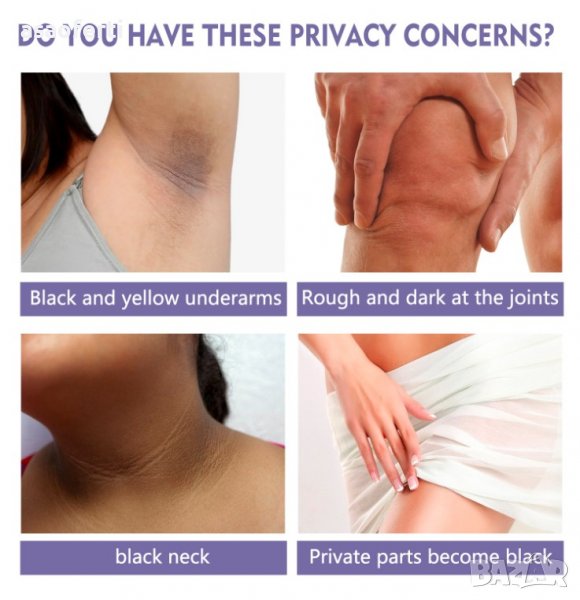 Избелване на черна или жълта кожа на подмишниците, кожата на лактите, кожата на коленете, кожата на интимните части.