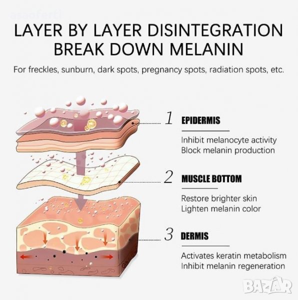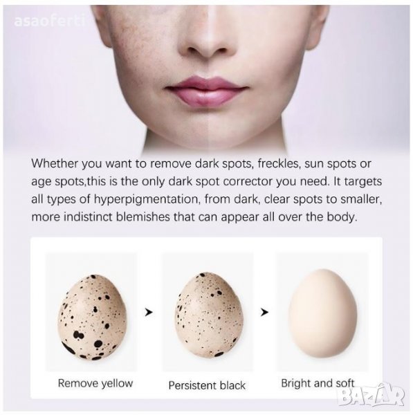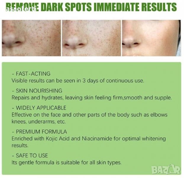 Кремът помага за премахване на петна, изравняването на тена на кожата и минимализира появата на тъмни петна от слънцето.