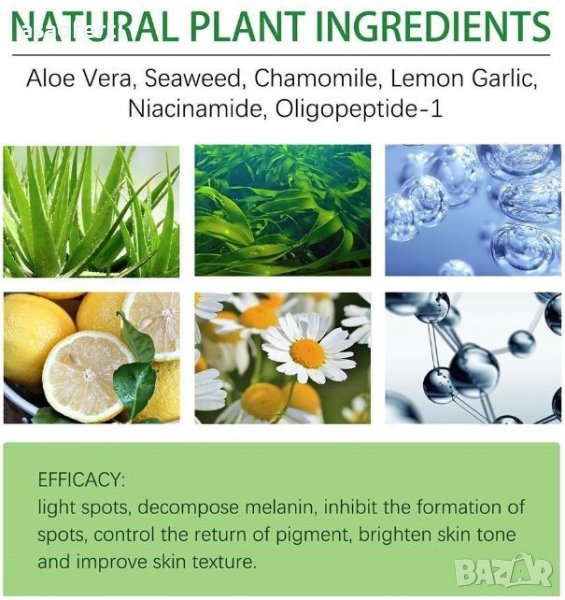 Състав: Алое вера, морски водорасли, лайка, лимонов екстракт, екстракт от чесън, нияцинамид, олигопептид-1