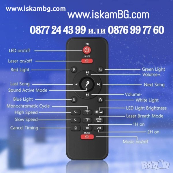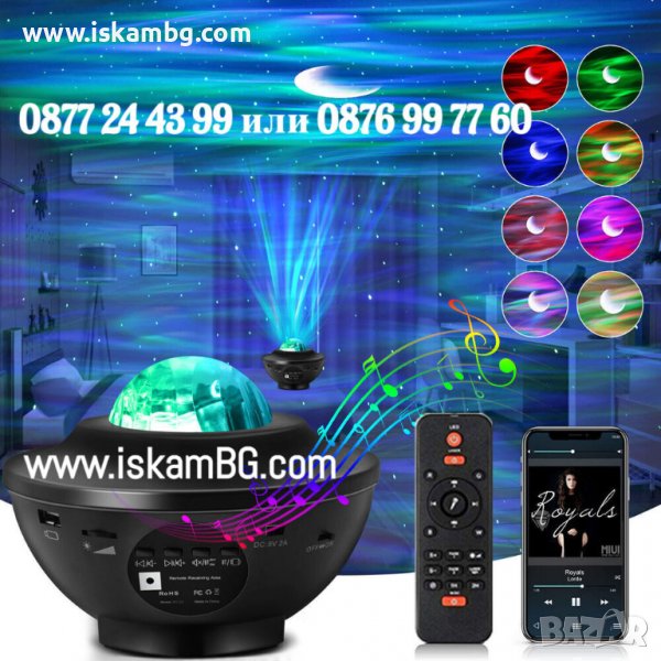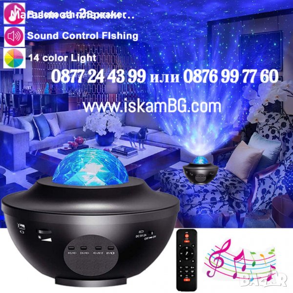 Страхотен RGB прожектор с вградена колонка с bluetooth. Проектираща лампа ще изпълни стаята с магически съзвездия, цветни картинки и неподозирани ефекти. Нежните светлини, които ще се гонят по стените и тавана действат успокояващо и приканват съня да дойде по-бързо. Колонката може да работи с USB(флашка) или блутут. От дистанционното можете да настройте лампата да свети с фабрично зададените програми или да изберете програмата при която светлината реагира на звуците. Също така може да се настройва след колко време да се изгаси(1 или 2ч.). Романтичен подарък или забавление за вашето дете, отличен избор за подарък по случай някой празник.