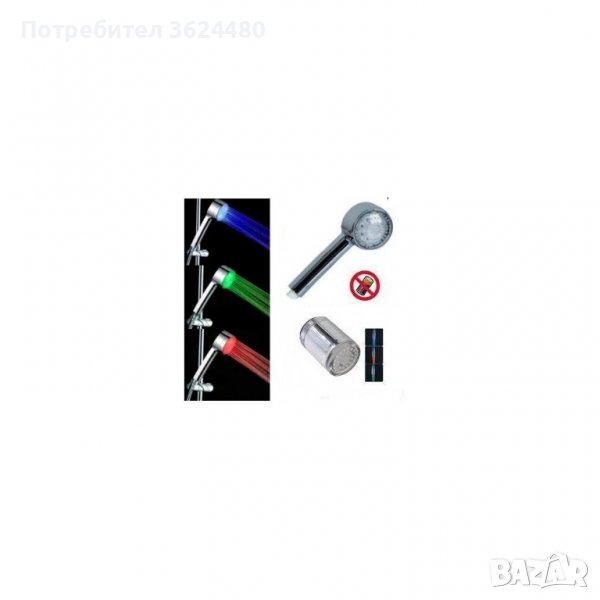 душ батерия. Необходимо е само да махнете стария душ и да поставите новия. Слушалката има температурен сензор и в зависимост от температурата водата свети в различен цвят. Светлинните се захранват от мини динамо, вградено в душа, което се задвижва от водната струя и работи без батерии.