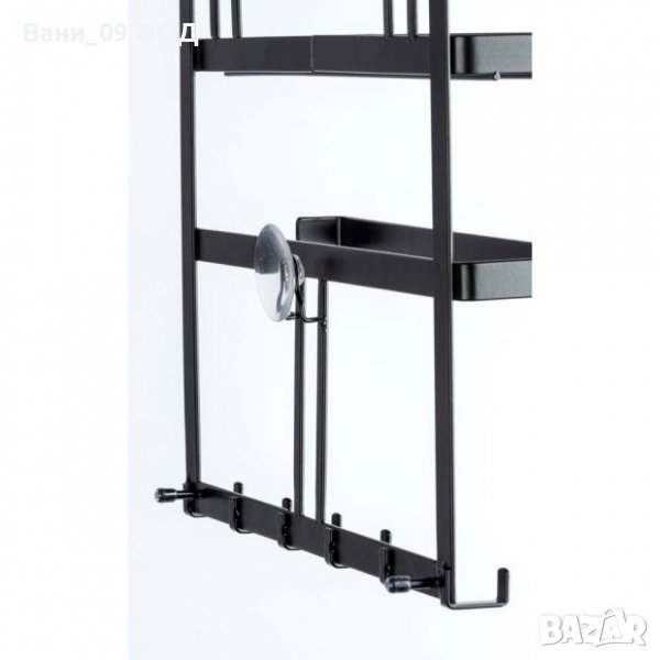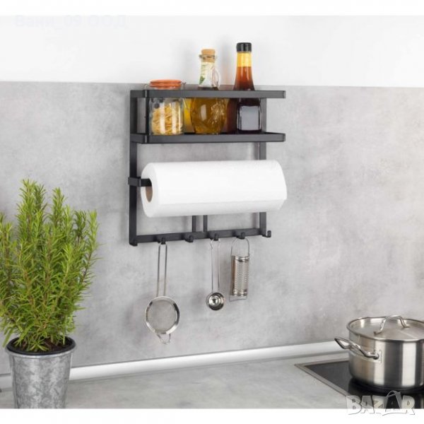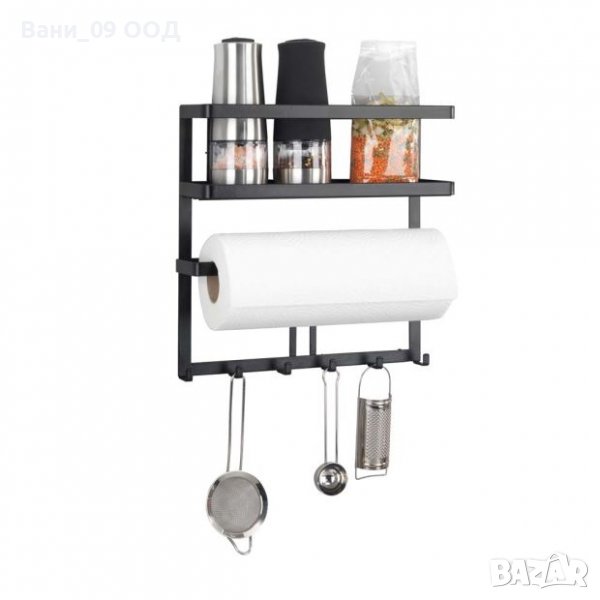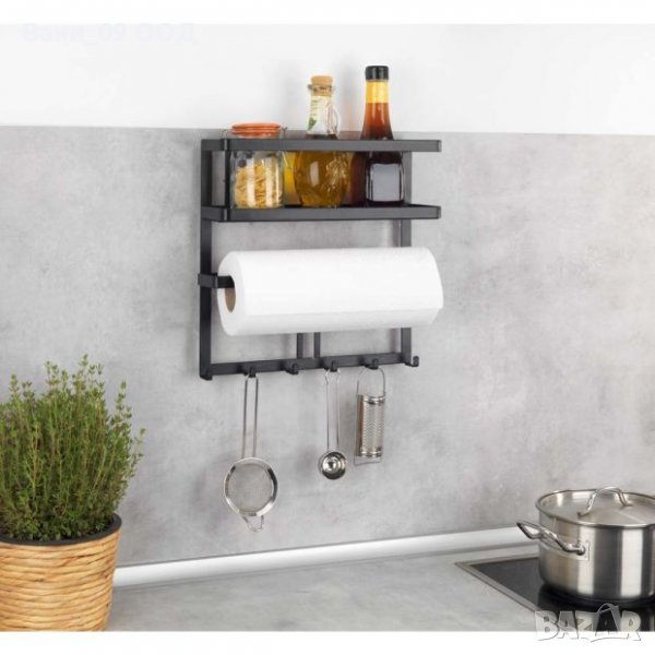 Практичен кухненски органайзер, разполагащ с кукички/закачалки, етажерка за шишета/бурканчета, както и поставка за кухненска хартия.