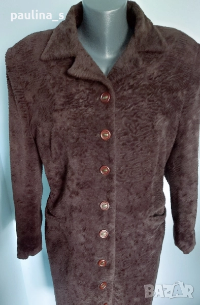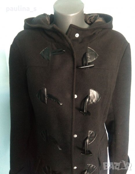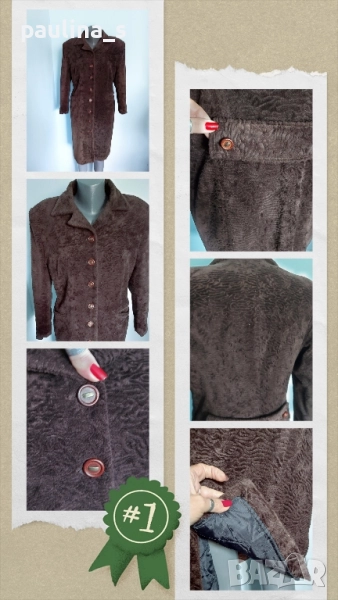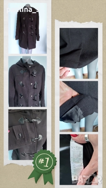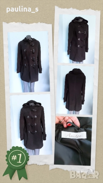1️⃣. Колаж / L / 2XL - "Aniston". Цената е крайна, без пазарлъци 25 евро. Уникално палто с качулка, като ново. Материята е немачкаема и еластична, много мека като плюш. Моделът се вижда добре, външни джобове, закопчава се с тик-так копчета и външни декоративни елементи от кожа копчета, втален силует.