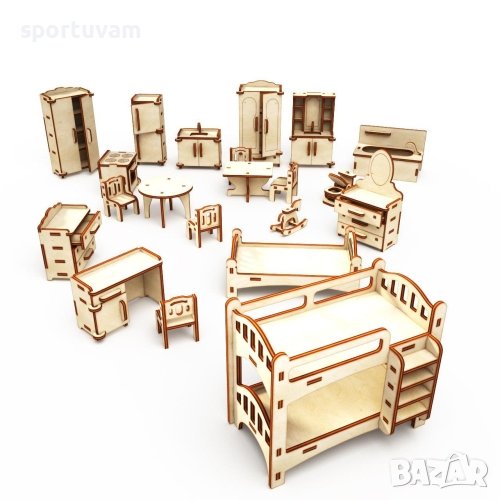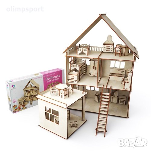 Дървена къща за кукли на три етажа напълно обзаведена с мебели и с пристройка. Сглобяем комплект, направен изцяло от естествен материал – бреза. Всеки елемент е изработен чрез технологията на лазерно рязане, осигуряваща прецизност на размерите и гладкост на елементите (Елементите предварително са отрязани в дъската и лесно се изваждат). Сглобяването е без лепило и ножици, елементите само се щракват един в друг - щифтът се закрепя в улея. Всеки комплект съдържа подробна и ясна инструкция за сглобяване с картинки. Може да се използват бои и да се оцветят елементите. Продуктите са приятни на допир и миришат хубаво. Сглобяемите комплекти WOODPY развиват креативност, памет, когнитивни умения, концентрация и умения за фина моторика у децата. Височина на етажа - 17 см. Материал – дърво от Бреза. Сглобен размер - 39x42x57.5 см. Размер на опаковката - 400х20х54 мм. Тегло - 2.8 кг. Подходящи за деца над 5 години.