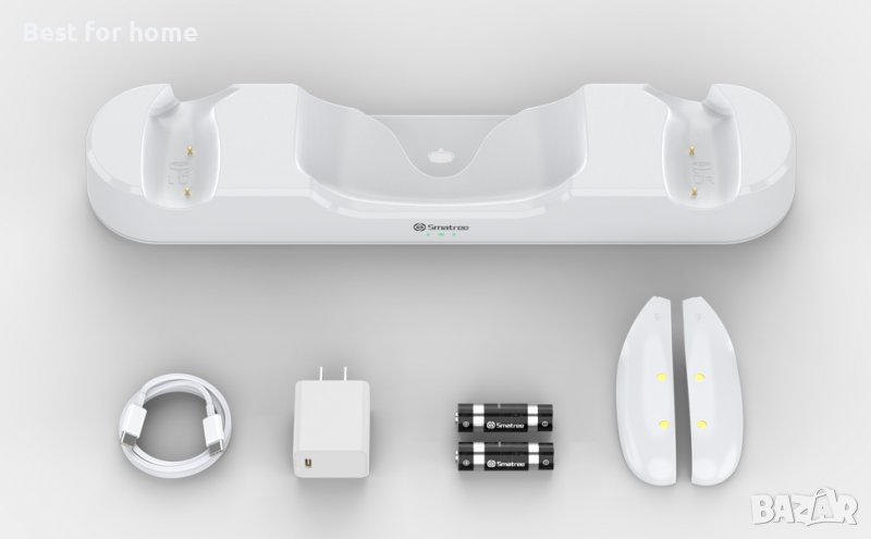 Пакетът включва: Ще получите база за зареждане, 1 USB-C кабел към USB-C, 1 USB-C адаптер, 2 капака на батерията и 2 акумулаторни батерии AA.