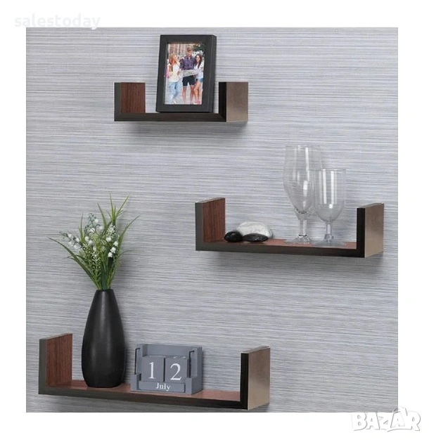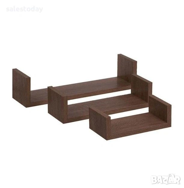 Тъмнокафяви дървени стенни рафтове с лесен монтаж и скрити опори на гърба, с размери 42.5x10.2x10.2 cm, 35.5x10.2x8.7 cm & 22.5x10.2x7.2 cm. 6-те винта и шайби са включени.