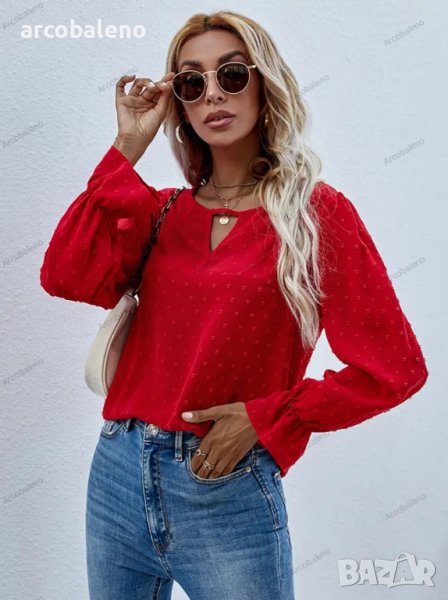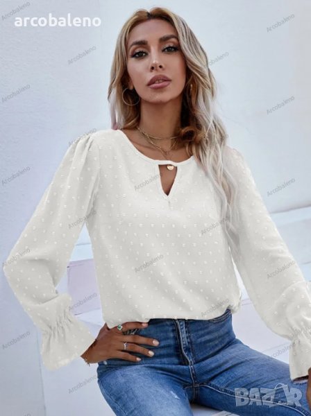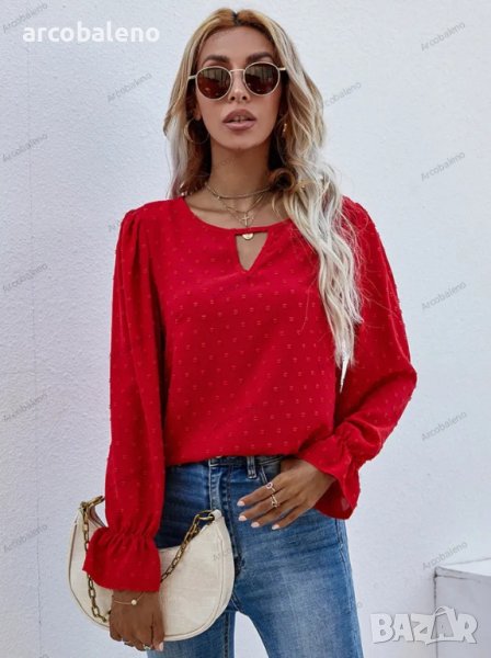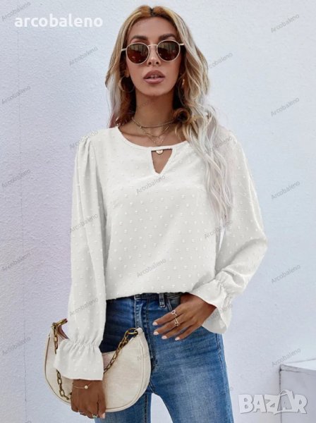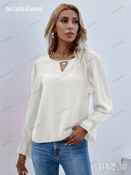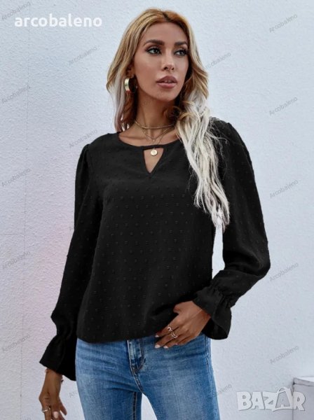 Дамска едноцветна риза с кръгло деколте и дълъг ръкав на точки с модерен стил и мека и удобна материя. Независимо дали е ежедневно, пазаруване, работа, срещи и т.н., може да се носи на машина или на ръка. Материята е устойчива на намачкване и на начупване. Размерът се измерва на ръка, като е нормално да има грешка от 1-3см.