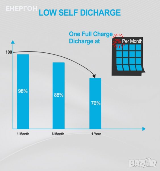 6 – Саморазрядът е подобрен и е нисък – около 3-7% на месец при 20градуса температура