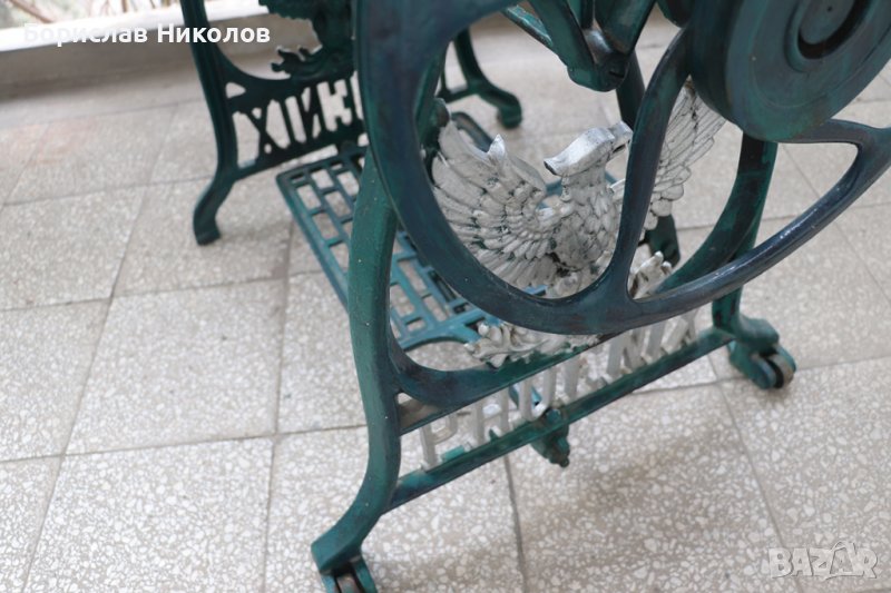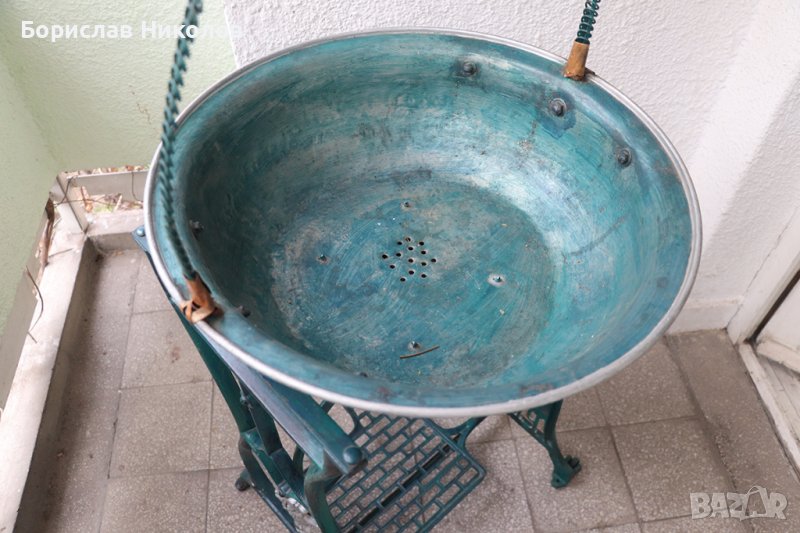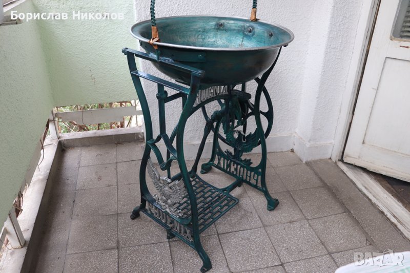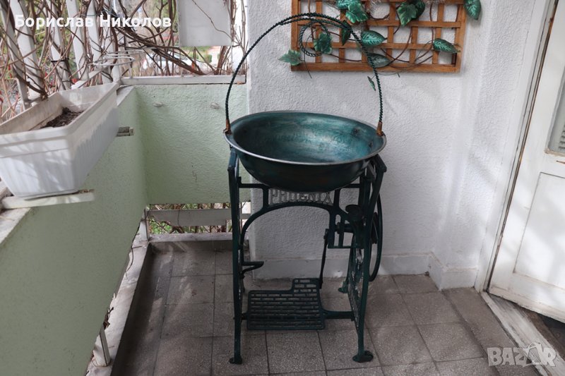 Уникален цветарник за вашата градина!Крака от шевна машина и леген за цветята от мед - старателно направен от маистор!Лично предаване в София защото доста тежи!