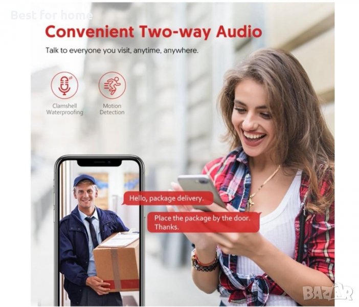 Тази камера за външно наблюдение разполага с двупосочен гласов домофон в реално време, вграден микрофон и високоговорител против шум. Можете да видите самоличността на вашите посещаващи клиенти, докато сте далеч, и можете да общувате с посетителите по-ясно и гладко.