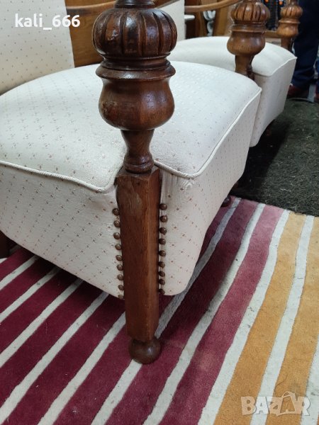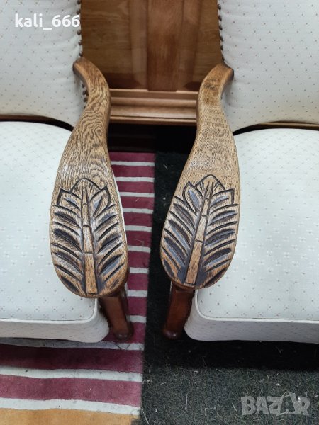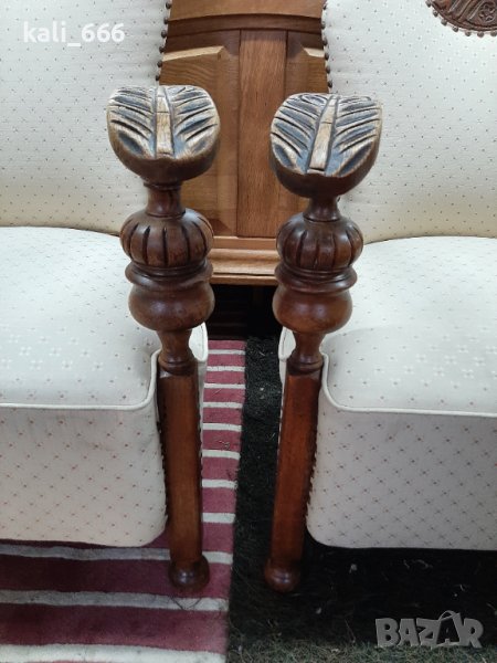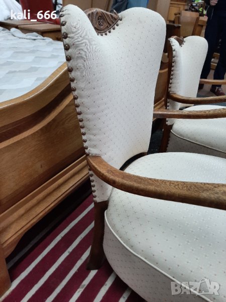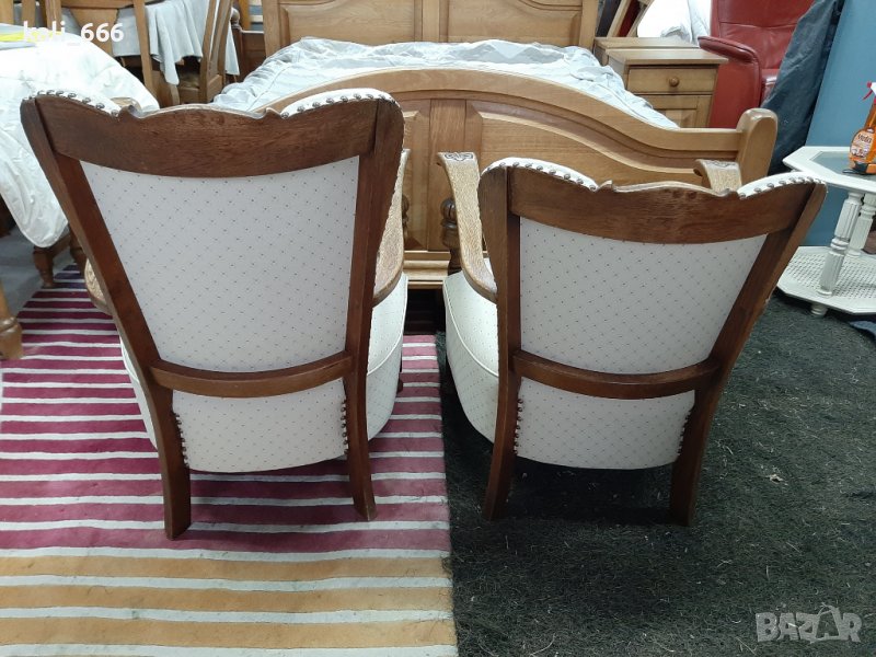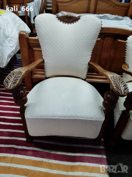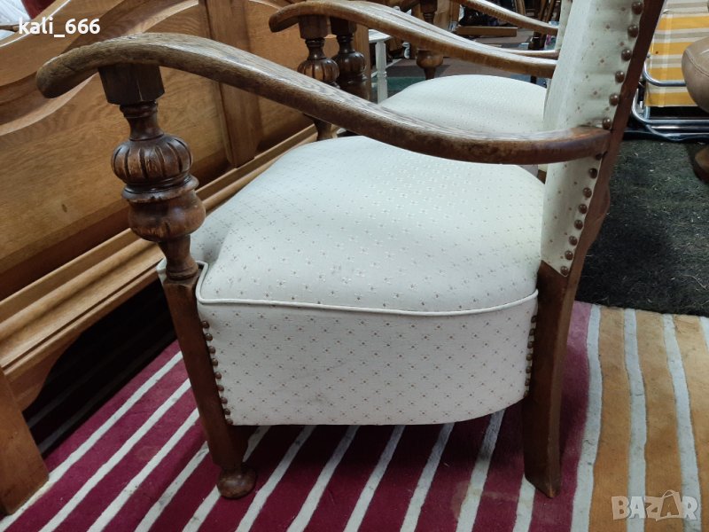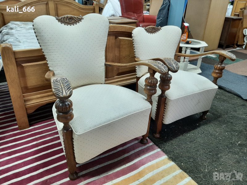 Комплект от два броя ретро кресла, дамско и мъжко, изработени от масивно дърво и декорирани с резби и капси. В добро състояние с нормални следи от употреба. Максимални размери: ширина 67 см, дълбочина 70 см, височина-дамско 75 см, мъжко 85 см. Седалка: дълбочина 50 см, ширина 55 см, височина от земята 40 см. Посочената цена е за брой, не се продават поотделно. Закупени от Холандия.