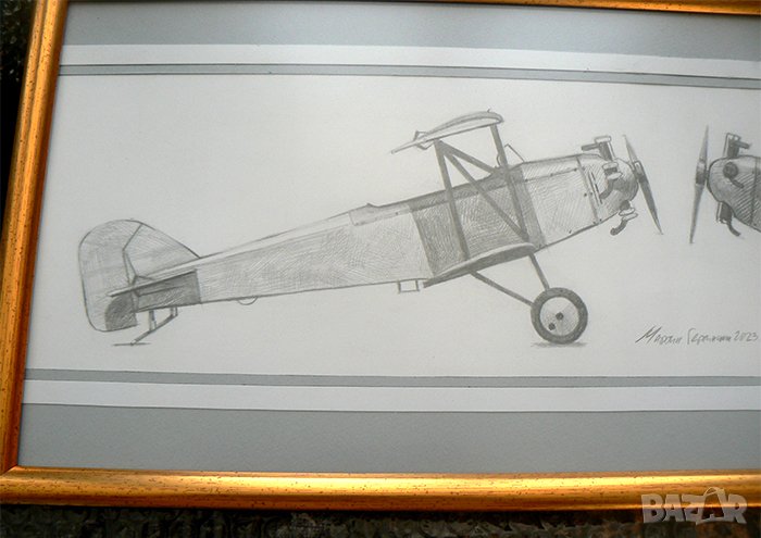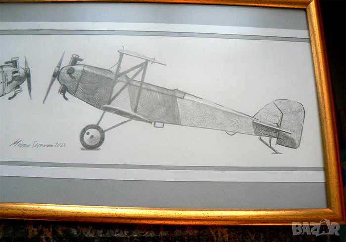 Рисунка с два легендарни стари български самолета, ДАР-1 и ДАР-1А. Молив върху картон. Размера с рамката е 23 на 55,5 см. Художник Мартин Гергински. 2023 г.