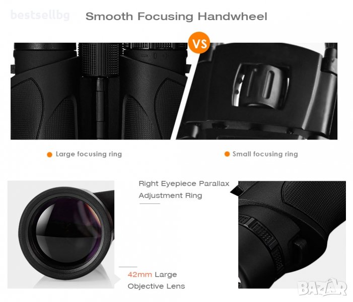 - HD бинокъл с висока разделителна способност: 10x увеличение с 42 mm обектив.